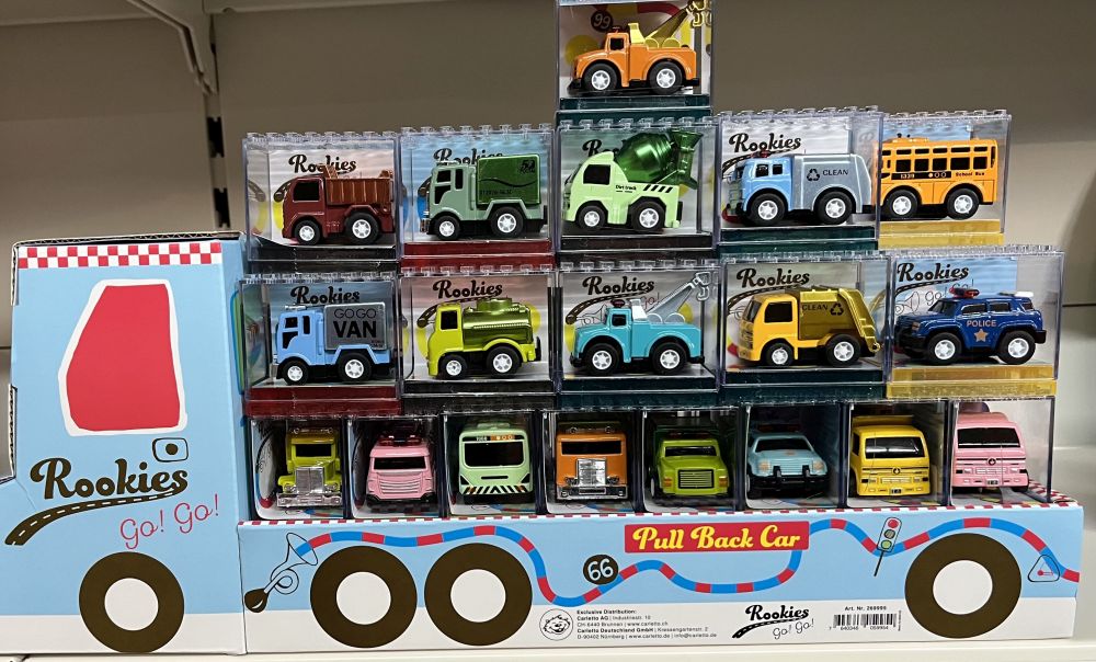 | Art Nr: S 4 Rückzugs mini Flitzer & Trucks Pull-Back-Flitzer in Minitaturformat, darunter ein spritziger Polizeiwagen, ein fassungsstarker Pick-up und zeitlose Klassiker. Jedes Modell ist mit einer Pull-Back-Funktion ausgestattet. Diese ermöglicht es, das Fahrzeug durch einfaches Zurückziehen und anschliessendes Loslassen in Fahrt zu bringen. Die Mini-Flitzer sind sicher in stabilen Acrylbausteinen (6,2 cm x 3,9 cm x 5,5 cm) mit farbigen Böden verpackt. Für je 2.95