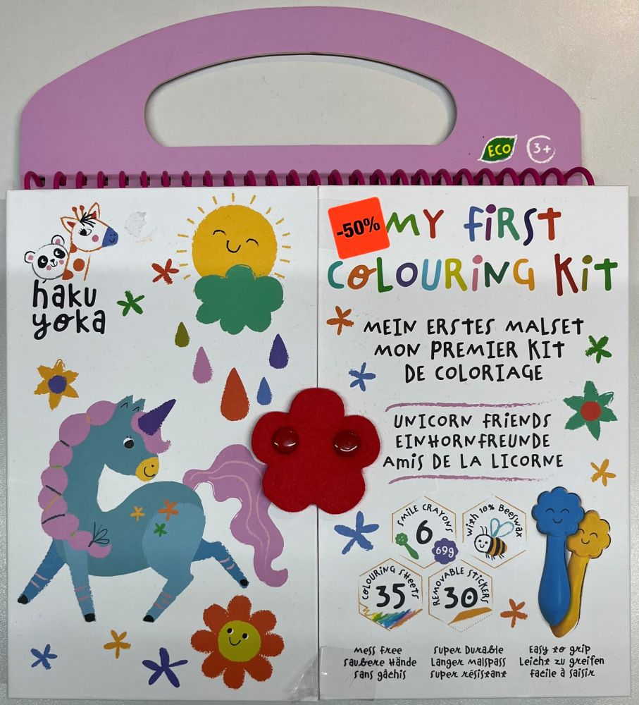 | Art Nr: S 27 Mein erstes Malset NEU Mit diesem ersten Wachsmal-Set entdecken Kinder die wunderbare Welt von Haku Yoka und gestalten mit kreativer Fantasie zauberhafte Einhornmotive! Das Mal-Set besteht aus 6 bunten Wachsmalstiften, 30 wiederverwendbaren Stickern und einem Einhorn-Malbuch mit Ringbindung und Klettverschluss. Das Buch hat für die Kreiden kleine Fächer zur Aufbewahrung und ist mit einem Tragegriff ideal für Reisen und Unterwegs. Auf 35 abtrennbaren Seiten leben sich kleine Künstler kreativ aus und tauchen in eine bunte Welt voller Blumen, Tiere und Einhörner ein. Die wiederverwendbaren Sticker ergänzen perfekt die vorgedruckten Motive. Die hochwertigen Wachsmalstifte sind durch ihre Form ideal für Kinderhände geeignet. Beim Malen färben die satten Farben nicht ab und schaffen durch die weiche Textur ein völlig neues Malerlebnis. Haku Yoka Wachsmalkreiden haben einen Bienenwachsanteil von 10 % und sind für Kinder ab 3 Jahren ideal geeignet.